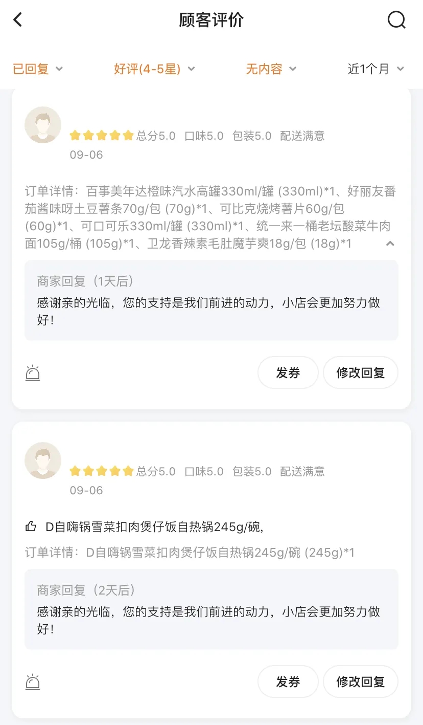 同時,在外賣平臺上,與客戶進行積極友好的互動,也有助于門店積攢口碑。劉店長表示,自己會要求門店的店員均須下載外賣平臺的商家版本,以便及時回復顧客的在線信息。而客戶的購后評價,無論好評還是差評也均要及時回復,及時解決。