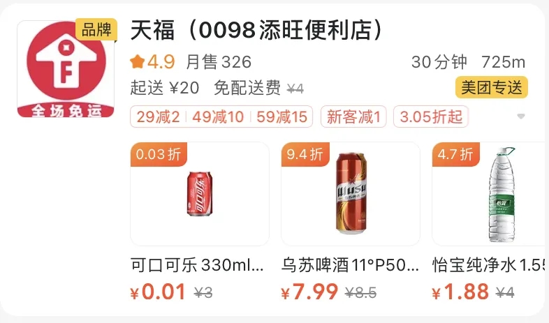 大家都體驗過,在打開外賣平臺,挑選心儀的商品前,總是先對比一下不同商家之間的優惠力度。為此,0098門店很好地運用了公司所提供的營銷資源支持,緊跟公司政策,通過“免配送費+折扣+滿減券”的組合活動,拉動新客,促進活躍度。