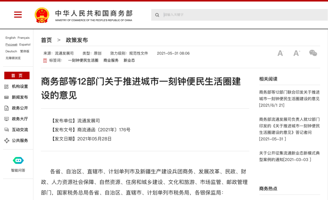 《關于推進城(cheng)市一刻鐘(zhong)便民生活圈建設的意見》