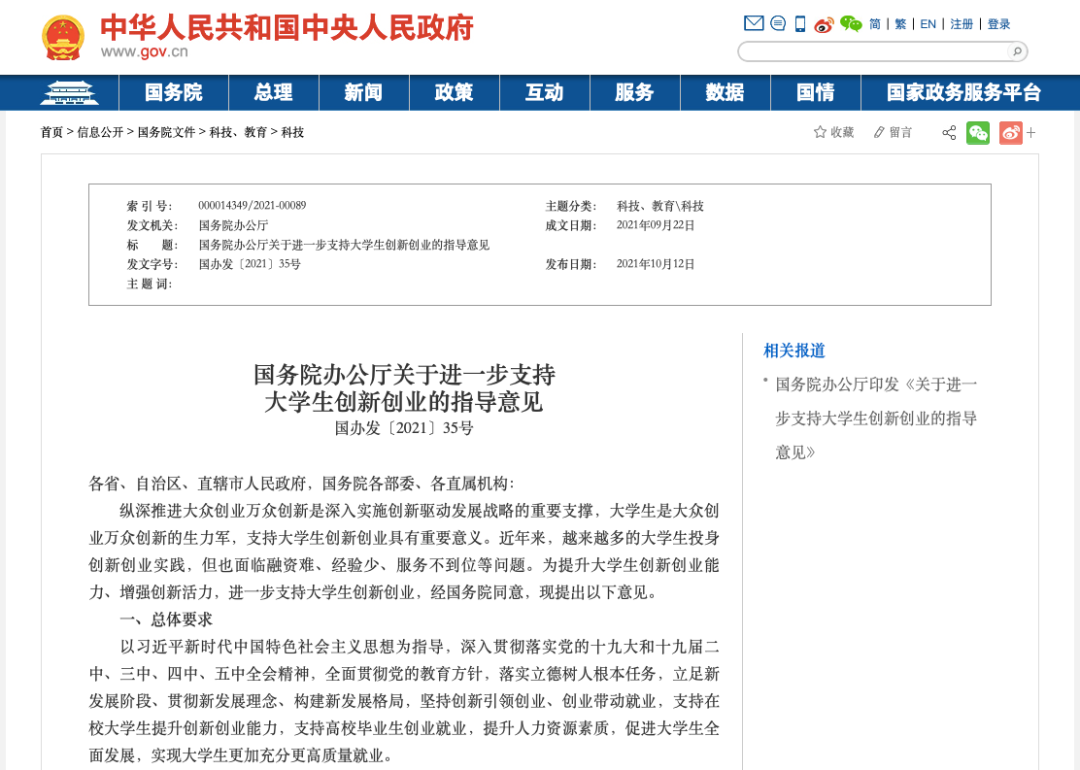 10月12日,國務院辦公廳印發《關于進一步支持大學生創新創業的指導意見》。《意見》指出,大學生是大眾創業萬眾創新的生力軍,支持大學生創新創業具有重要意義。