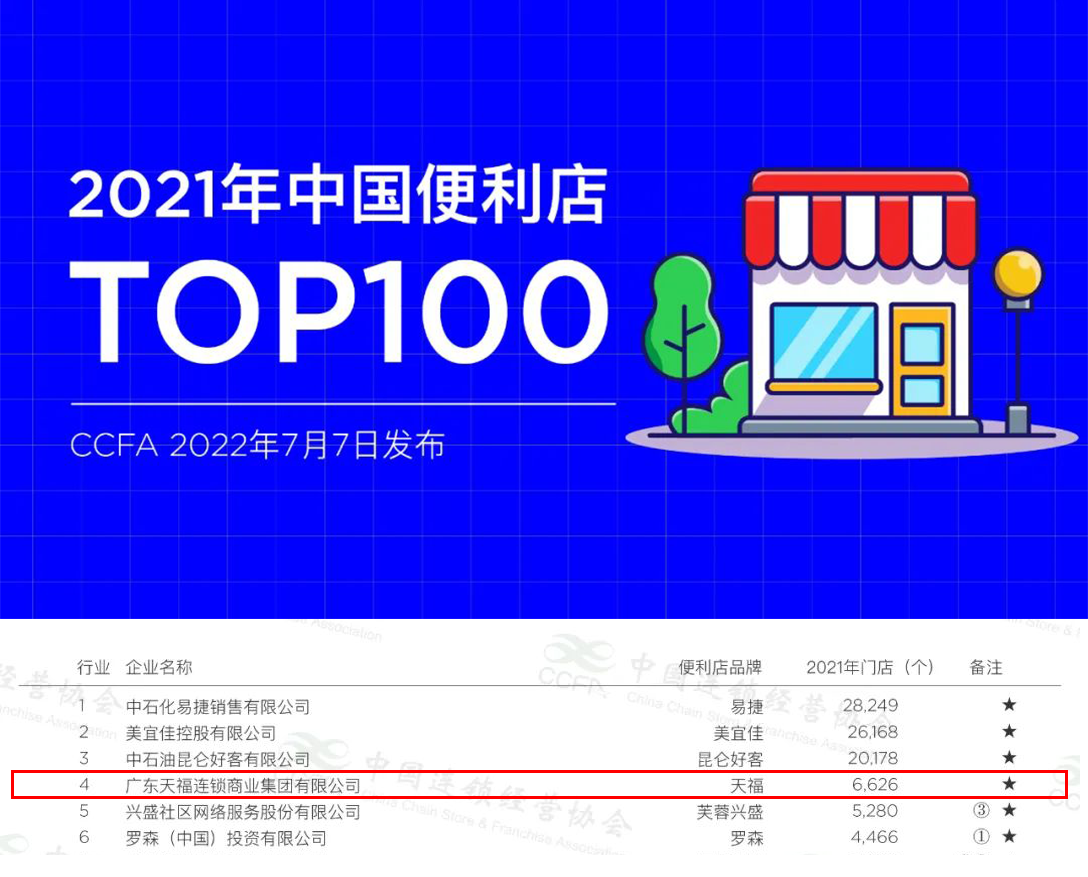7月7日,中國連鎖經營協會(CCFA)發布“2021年中國便利店TOP100”榜單,天福集團憑借高速的發展和強大的品牌影響力,以6626間的門店數量,榮登全國第四。