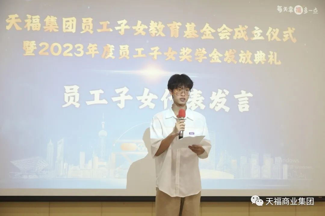 活動最后,天福員工子女陳同學作為學生代表上臺發言,分享了他在刻苦學習之路上的收獲與感悟,并對所有辛勤付出的天福家人們表達了衷心的感謝。未來,天福員工子女教育基金這顆火種將繼續點亮學子們的未來,讓他們的前路更加光明璀璨。